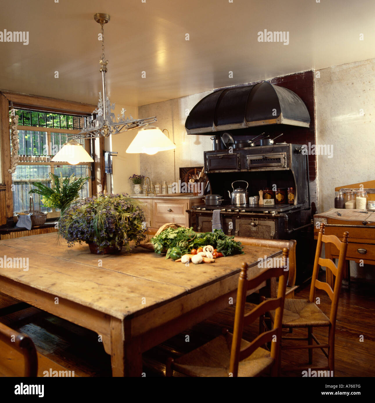 Victorian Style Pendant Lamps Over Old Wooden Table And Chairs In Basement Kitchen With Large Black Oven Stock Photo Alamy